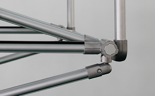 3.45度斜撑扣件:为了固定两根垂直的精益管,用此扣件两端分别连接于管材的两边,使扣件与两根管材之间呈等边三角形,连接后更加稳固。